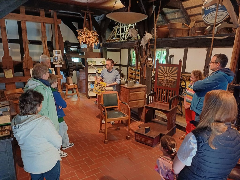 Auf ein lebhaftes Interesse stieß auch die von Uwe Plaß geleitete Führung durch den Kotten und durch den Speicher des Grönegau-Museums – ein Angebot, mit dem das Amt für Kultur und Tourismus der Stadt Melle und der Heimatverein Melle e.V. ihren Beitrag zum Gelingen des Aktionstages leisteten. „Ziel des Museums sei die Bewahrung und Dokumentation der Geschichte des Altkreises Melle besonders im Hinblick auf seine bäuerliche und handwerkliche Tradition“, erläuterte Plaß. Daher reicht die Bandbreite der ausgestellten Objekte von Alltagsgegenständen wie Kleidung, Geschirr und Möbeln bis hin zu Maschinen zur Flachsverarbeitung, einer komplett ausgestatteten Schmiede und einer Tischlerwerkstatt mit Holzbearbeitungsgeräten aus dem Forst.
